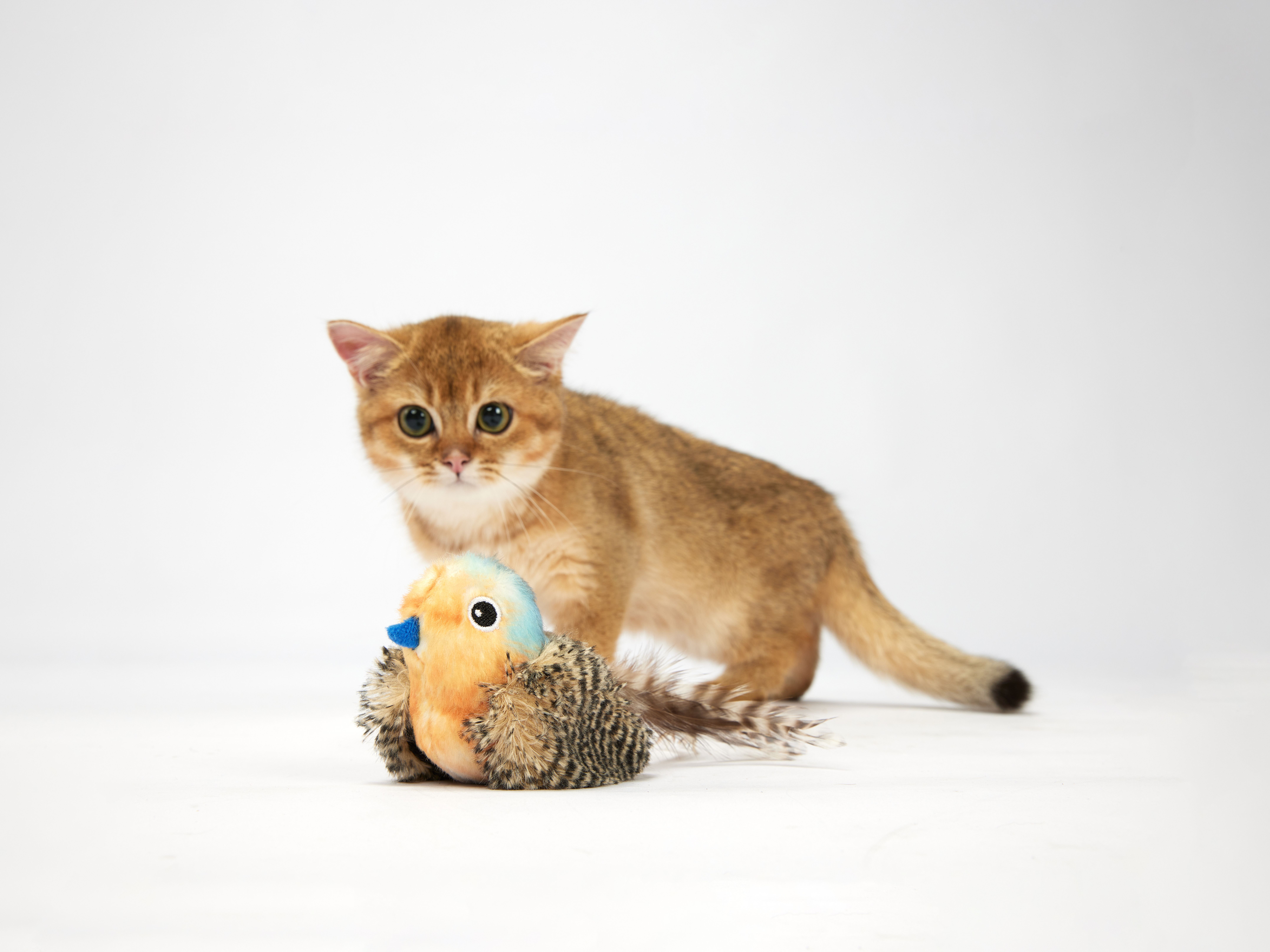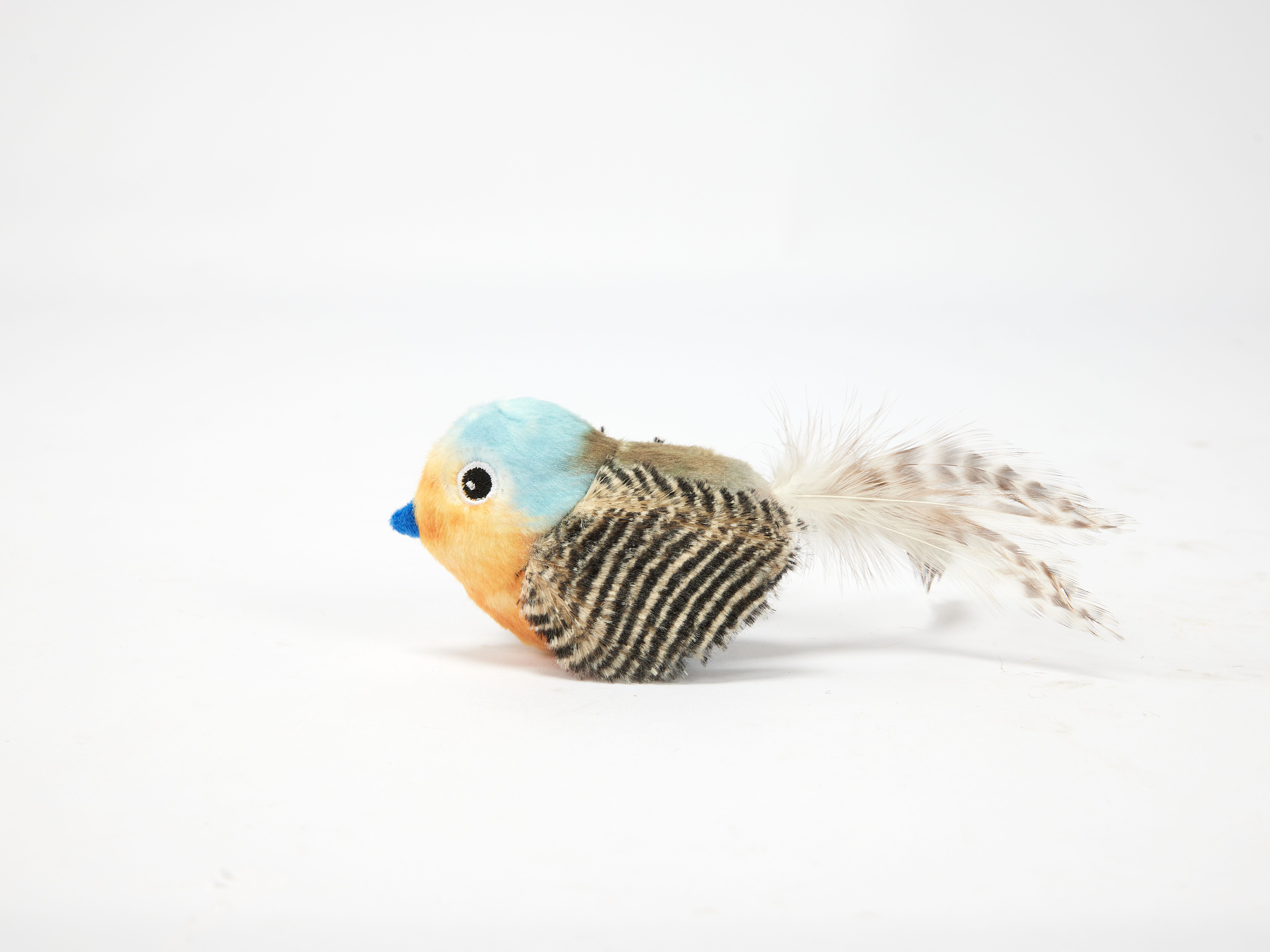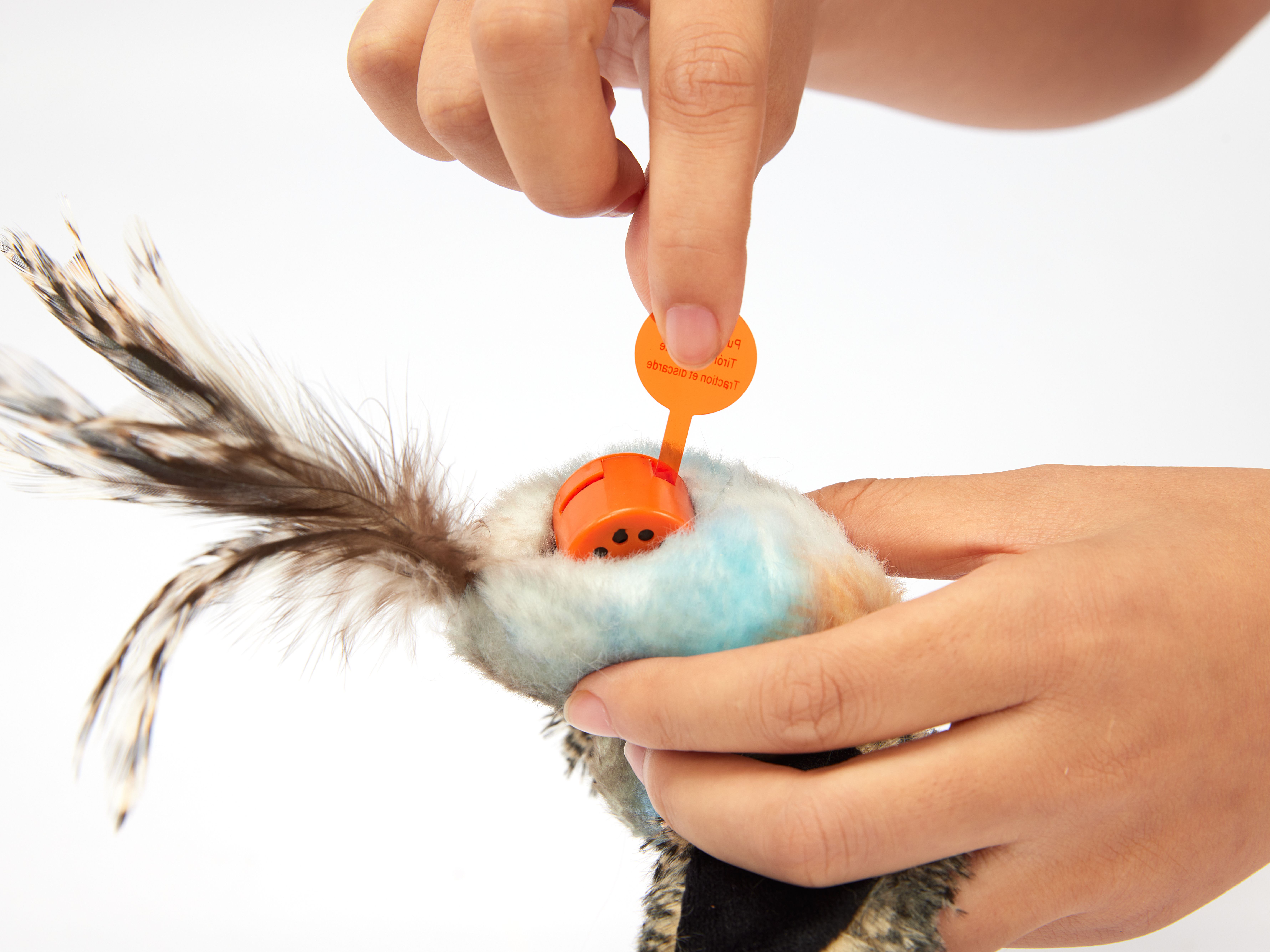Feito com corpo de peluche macio, fitas e penas reais, imitando a textura de uma presa real para maior estímulo sensorial.