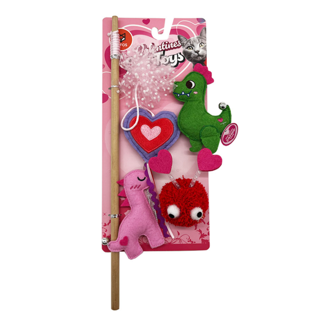 Conjunto de 6 peças: Inclui varinha com coração pendurado, dois dinossauros namorados, duas bolas com guizo e um pompom vermelho adorável.