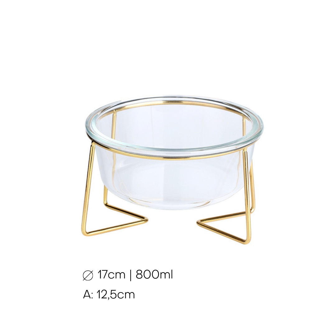 Taça de Vidro Transparente com suporte dourado de 800ml, ideal para proporcionar uma experiência de alimentação confortável ao seu gato. A inclinação fixa da taça ajuda a melhorar a postura durante a alimentação, facilitando a digestão e promovendo o bem-estar do seu gato.