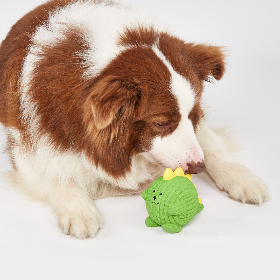 Design criativo: Bola em formato de dinossauro verde com detalhes divertidos.
