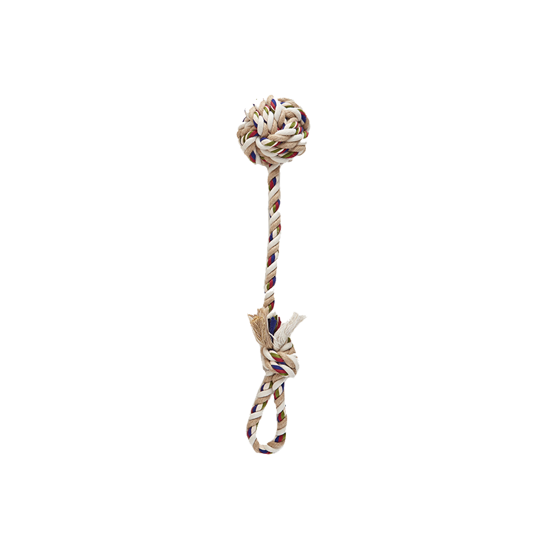 A bola entrançada e a pega ajudam a manter o brinquedo seguro e fácil de usar.