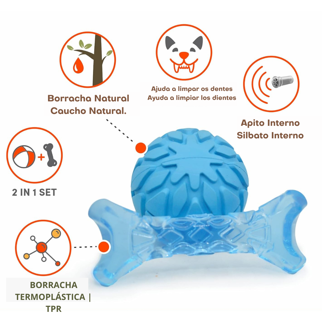 Conjunto 2 em 1: Bola (7 cm) e osso (11 cm x 4,5 cm), perfeitos para cachorrinhos.