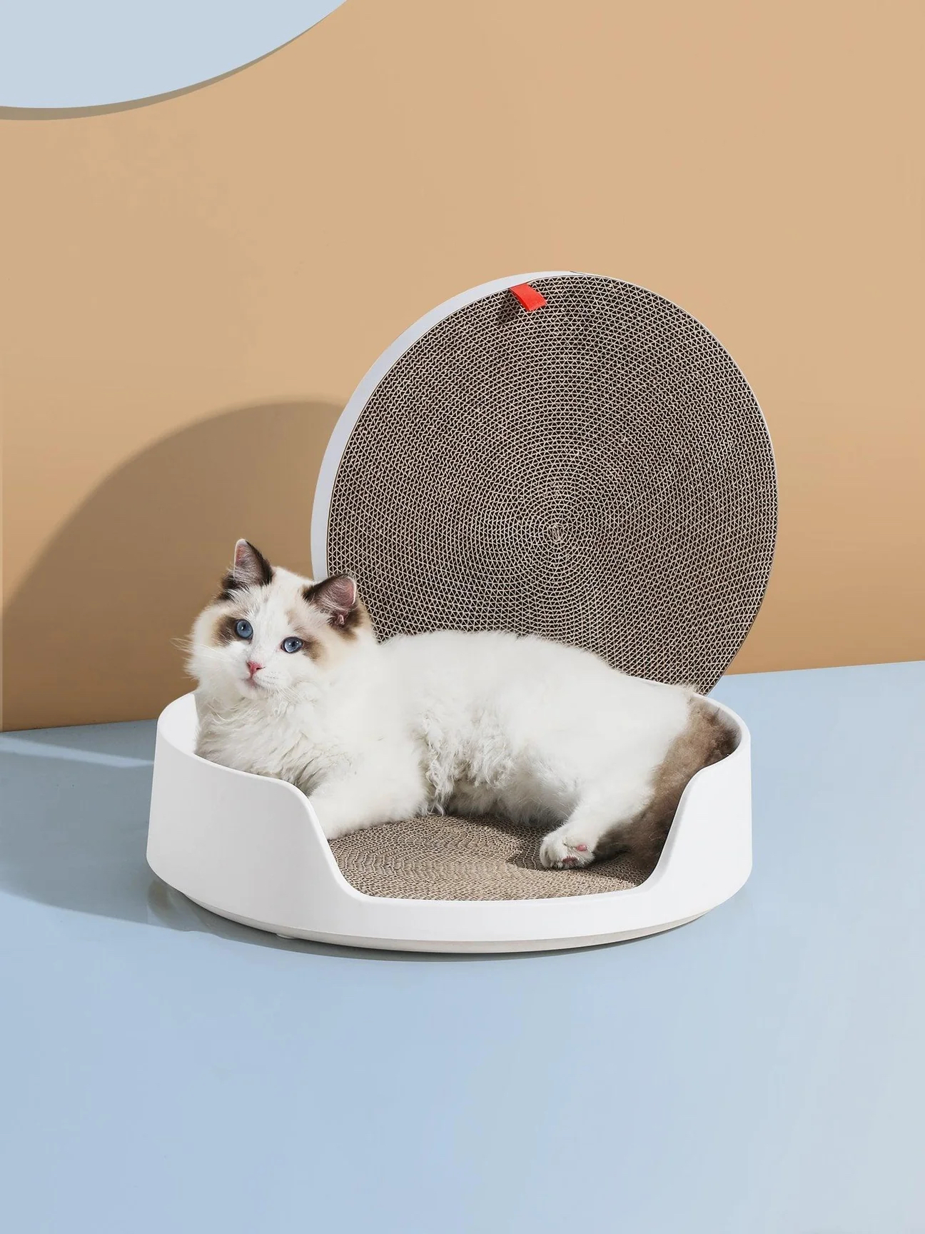 • Caixa de areia multifuncional para gatos que fornece 4 produtos em 1 - bandeja sanitária, pá, arranhador de cartão e uma cama.